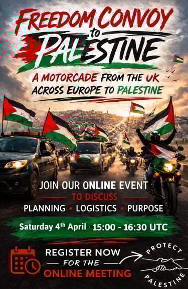Protect Palestine closed in October 2025. It has now been brought back to life for a final purpose. We announce the FREEDOM CONVOY TO PALESTINE - A Motorcade from the UK across Europe to Palestine.