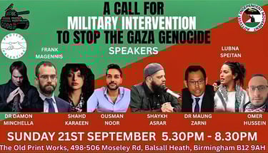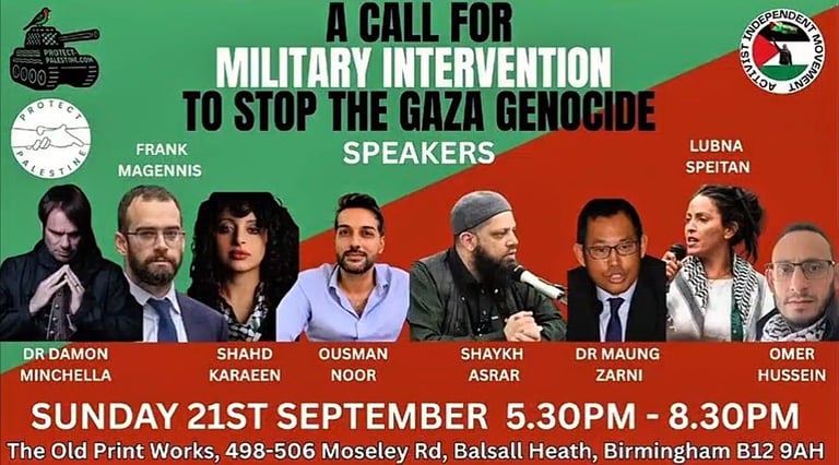 In September 2025, we also held the first ever event in the UK where activists united in support of military intervention to stop the Gaza genocide with speakers including Ousman Noor, Protect Palestine, Shaykh Asrar, Islamic Scholar, Omer Hussein, Palestinian Activist, Lubna Speitan, Palestinian Activist, Shahd Karaeen, Palestinian Poet, Shazia Akhtar, Ummah Action for Gaza, Dr. Maung Zarni, Genocide Scholar, Dr. Damon Minchella, Musician, Franck Magennis, Barrister.