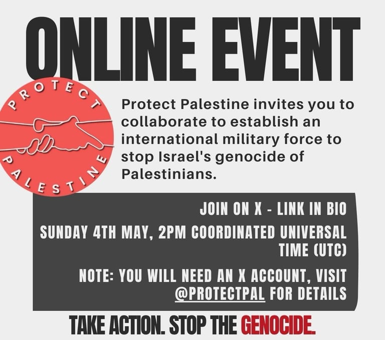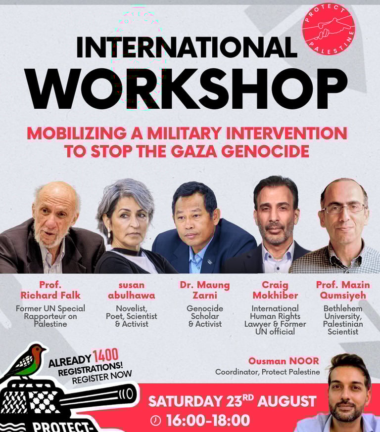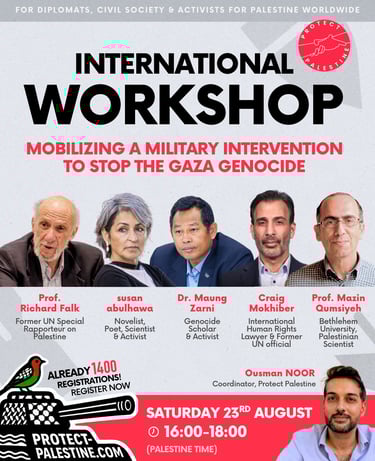 In August 2025, we held the first ever international workshop to Mobilise a Military Intervention to Stop the Gaza Genocide with over 1,000 people in attendance and speakers including Prof. Mazin Qumsiyeh: Director of Palestine Museum of Natural History, Bethlehem University, susan abulhawa: Novelist, Poet, Scientist, Activist, Craig Mokhiber: International Human Rights Lawyer, former UN official, Prof. Richard Falk, Former UN Special Rapporteur on Palestine, Dr. Maung Zarni, Genocide Scholar and Activist.